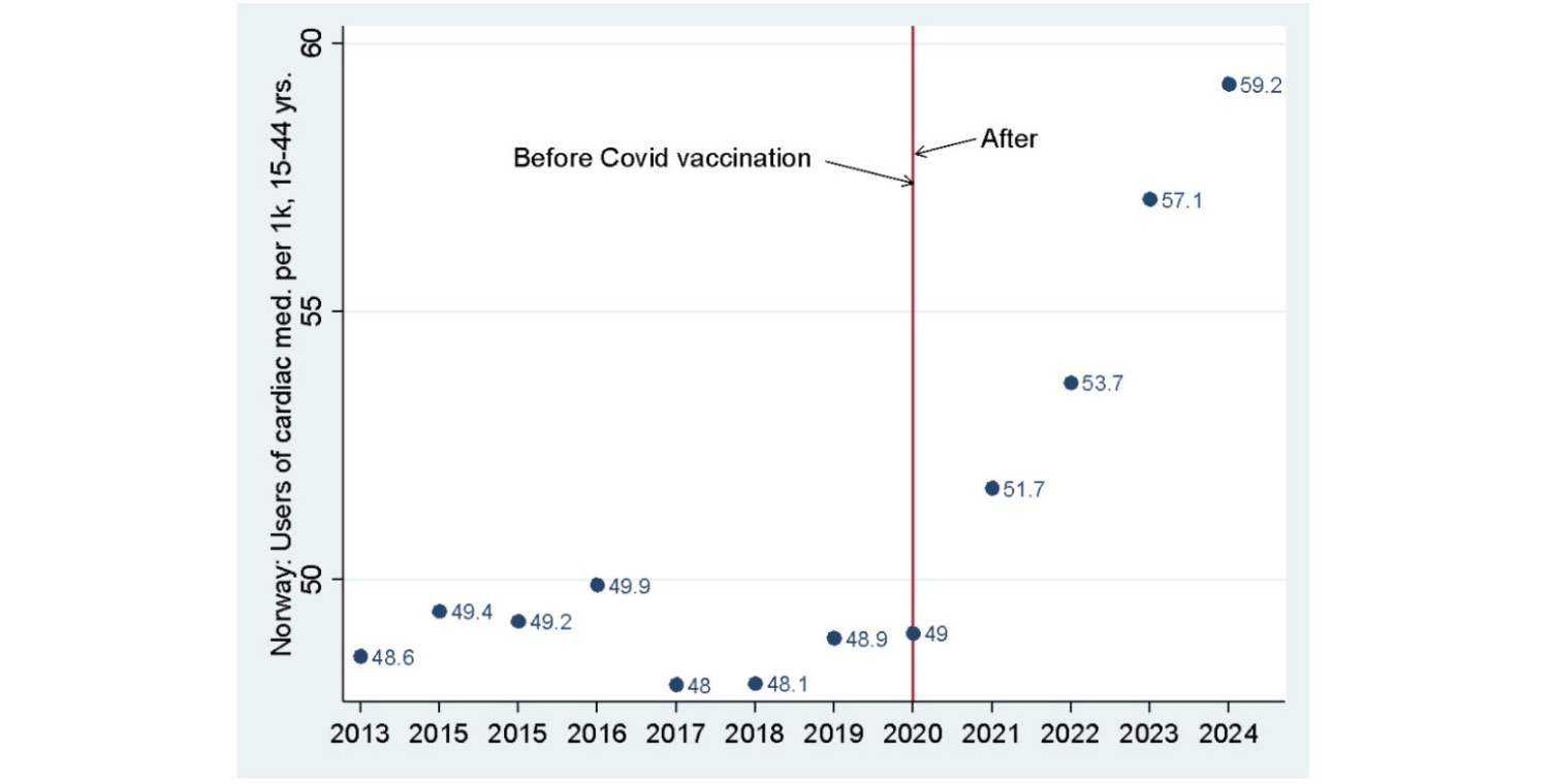 “New statistics from the Norwegian Institute of Public Health on the use of cardiac medication (class C, heart and circulatory system) among young people, 15-44 years old, shows an increase of over 20 percent from 2020 to 2024, illustrated in the graph (the y-axis is the number of users per 1000).”