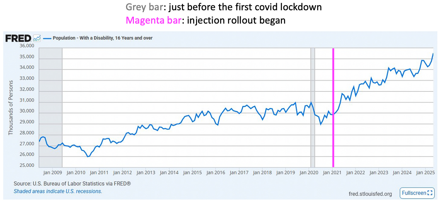 Here is a chart of official US Bureau of Labor Statistics disability data showing a marked rise in the population with a disability since early 2021: