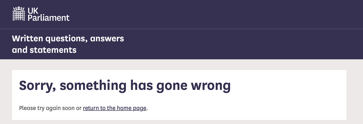 Incidentally, the link to the written answer to a question in Parliament in October 2020, where it was disclosed that “the United Kingdom operational false positive rate [for covid PCR testing] is unknown” now gives this message:
