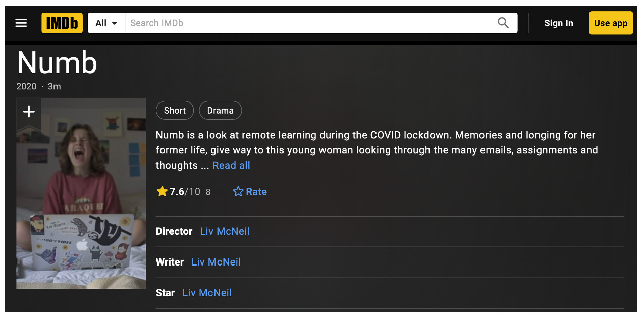 This is a very short post to share a link to this three-minute film Numb made in 2020 by a 15-year-old Canadian girl for a school project: