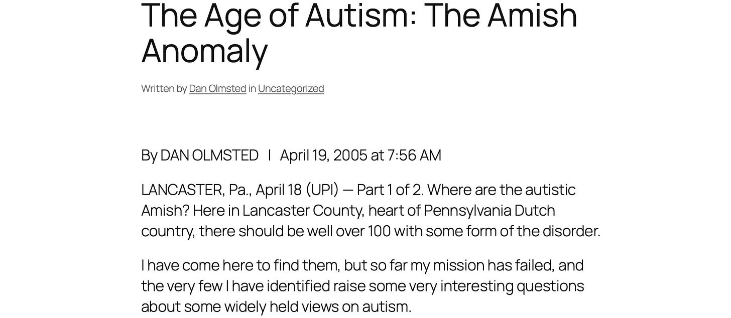 …there was a researcher… named Dan Olmsted. And he was very about curious about unvaccinated populations… and the Amish… one of those populations. And he went and did a study of the Amish in Lancaster County, Pennsylvania.