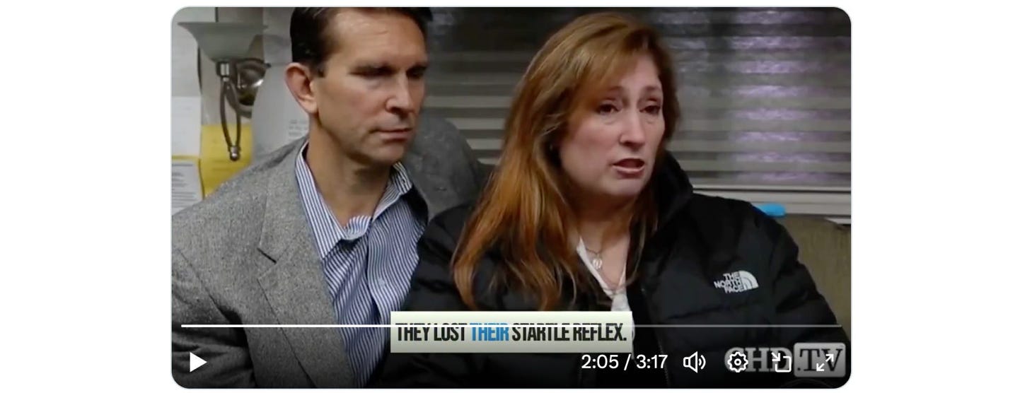 They lost all their reflexes. I’m an educational audiologist. I actually did the test for the stapedial reflex… a little muscle in the middle ear… just to see if a muscle they can’t control was still working. And it didn’t. The stapedial reflect dampens sound so your ears don’t hurt from a really loud sound. And both of them had no stapedial reflex. They stopped blinking, stopped yawning, stopped coughing, stopped sneezing. You could go towards their eyes and… nothing would faze them. They lost their startle reflex. I threw a telephone book on the floor behind them. And no startle… nobody even looked to see what it was.