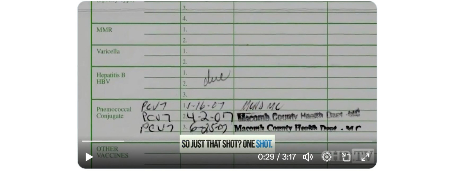 And we brought them in at 9 months and 4 days… We were doing one vaccine at a time, and [on] June 25th 2007 we brought them in for the pneumococcal shot… one shot…