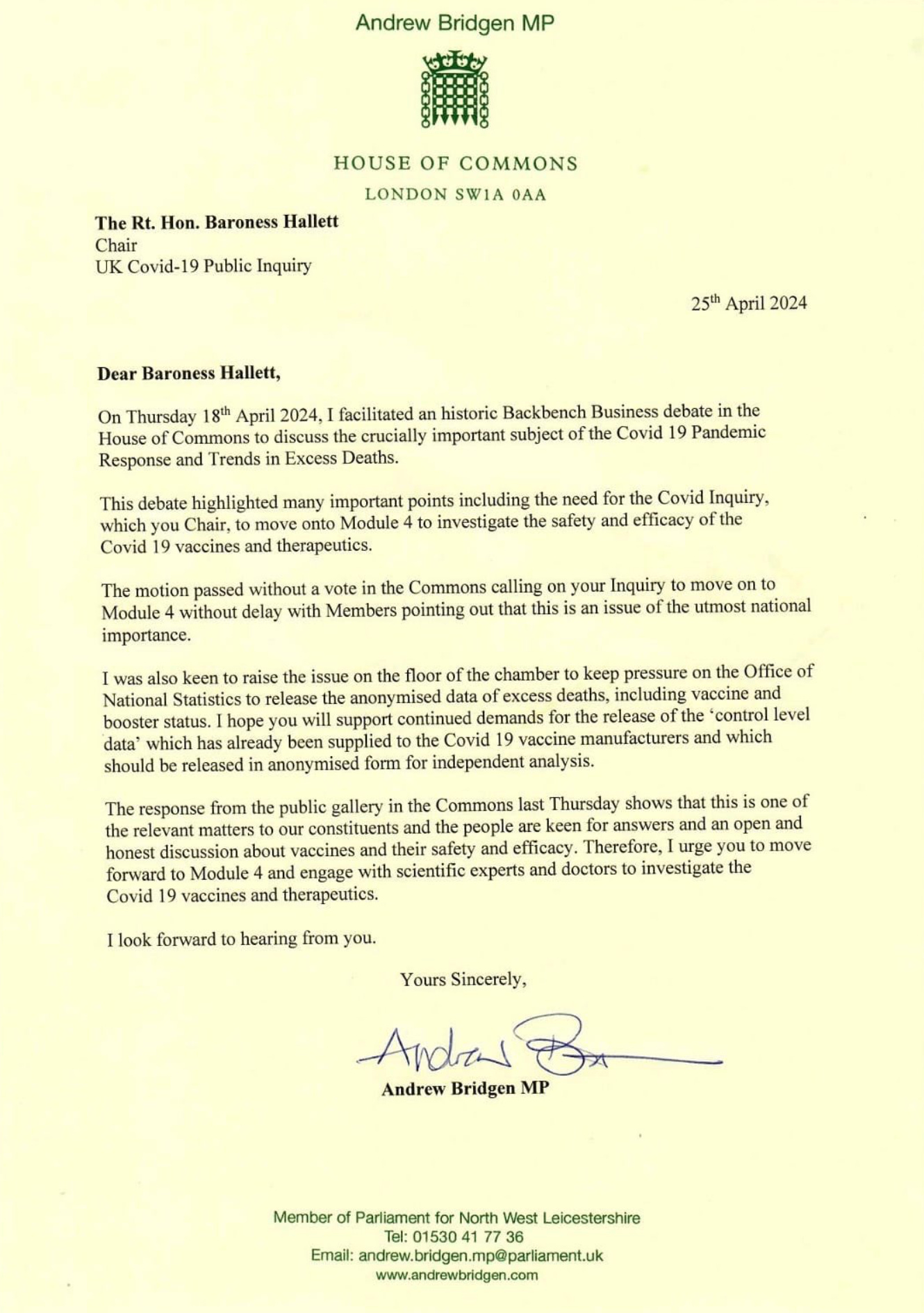 Here is a follow-up letter from Andrew Bridgen MP to Baroness Hallett a week later: